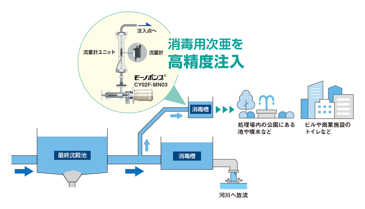 浄水場で次亜塩素酸ソーダや活性炭スラリーなどを定量注入するモーノポンプをご紹介しています。